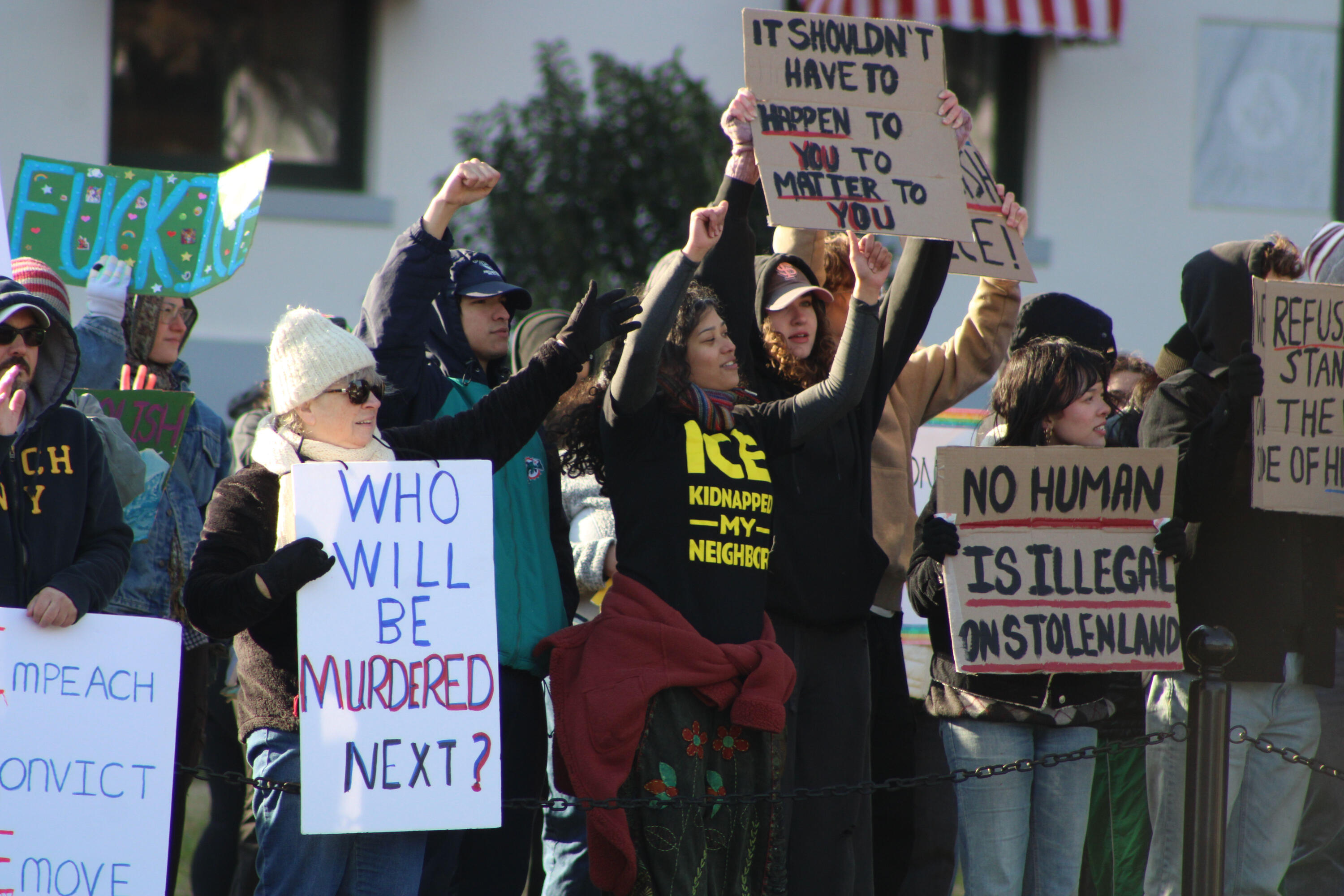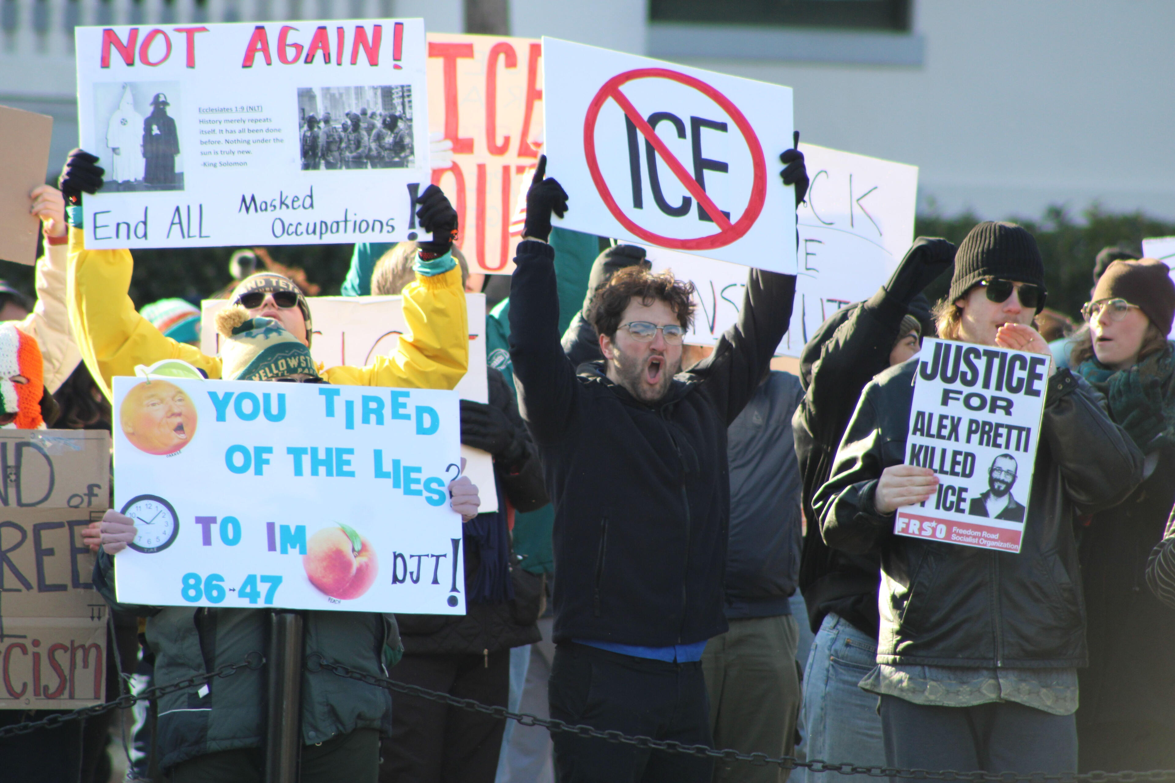 Several hundred students and community members lined Monroe Street outside the Florida Capitol Jan. 31 to protest U.S. Immigration and Customs Enforcement (ICE). Organized by the Tallahassee Coalition Against Trump, the protest was recognized as part of the National Day of Action Against ICE.“[Seeing this turnout] makes you feel like people are ready to fight ICE. The moment to challenge that institution is right now,” said Kaiden Rosa, Vice President of Tallahassee Students for a Democratic Society (SDS). Tallahassee SDS is one of 12 member organizations in the Tallahassee Coalition Against Trump.The protest occurred the day after the Jan. 30 national economic shutdown. Across the country Jan. 30 and 31, protestors called for an end to ICE in the wake of the recent deaths of Renee Good and Alex Pretti, who were killed by ICE agents in Minneapolis.During near-freezing temperatures in Tallahassee, protesters chanted for change.“In Minneapolis, it was in the negatives – we can’t complain about the cold here,” FSU student Juan Landaeta said. “I’m an immigrant myself. I feel I have the duty to stand up against what’s going on … I have to stand up for my fellow immigrants and for anyone that might be next, due to what’s going on with ICE and with this administration.”