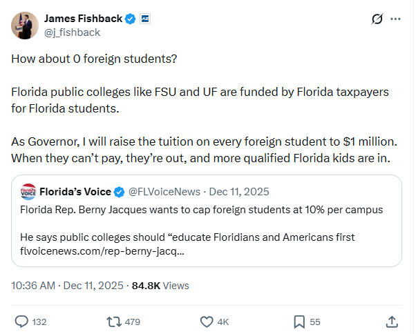 Florida Republican gubernatorial candidate James Fishback made the following statement regarding the enrollment of international students at public Florida institutions on X Dec. 11: